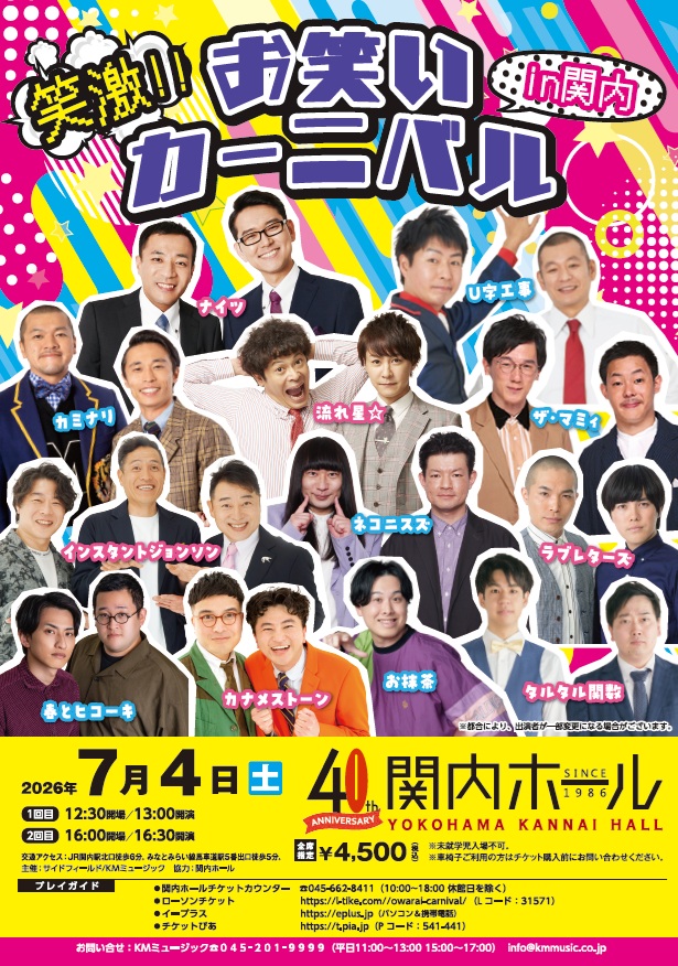 | ナイツ、U字工事、カミナリ、流れ星☆、ザ・マミィ、インスタントジョンソン、ネコニスズ、ラブレターズ、春とヒコーキ、カナメストーン、お抹茶、タルタル関数 笑激!!お笑いカーニバルin関内 ![]() |